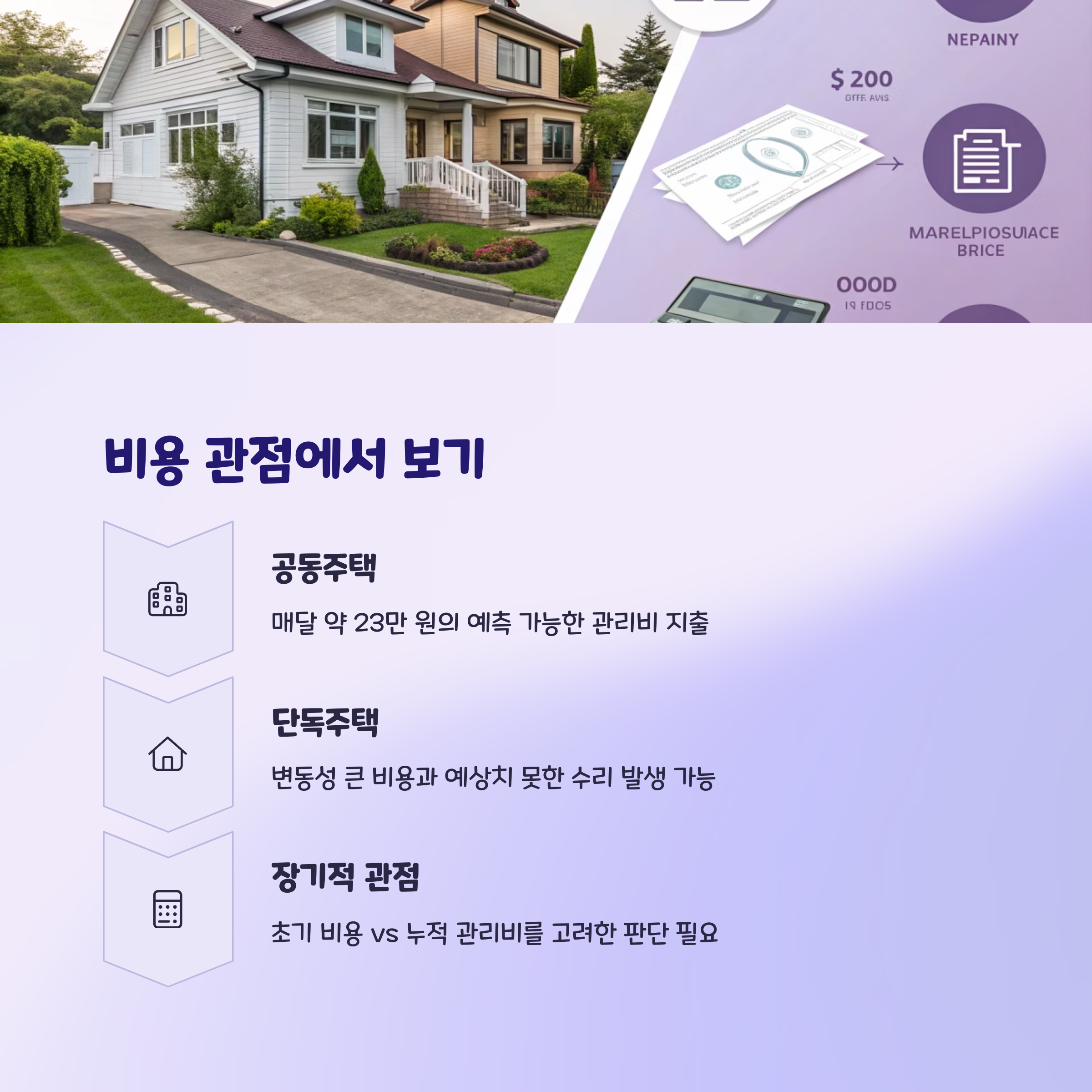 단독주택은 초기 비용은 저렴할 수 있으나, 장기적인 유지비는 예측 불가능한 항목이 많아 전체 주거 비용이 높아질 가능성이 큽니다.