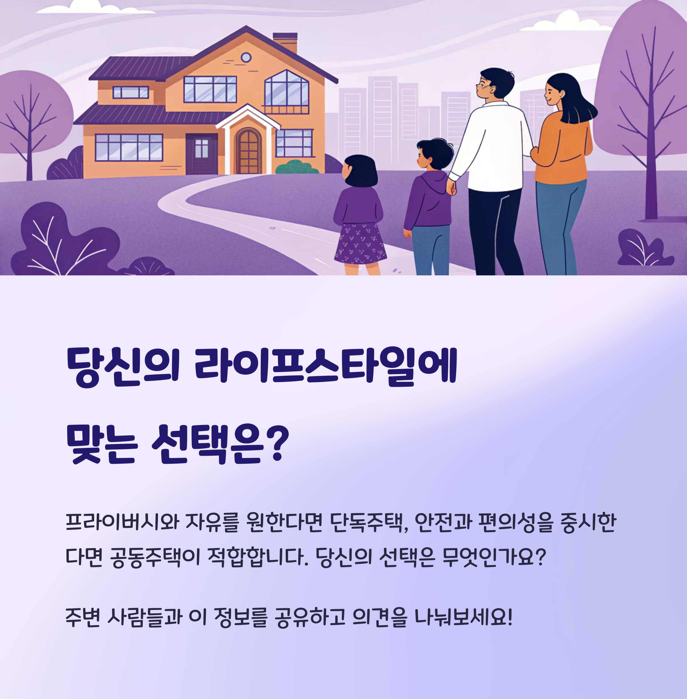 여러분은 단독주택과 공동주택 중 어떤 형태를 선호하시나요? 아래 댓글로 여러분의 의견을 나눠주세요! 더 많은 이야기를 함께 나누고 싶습니다.