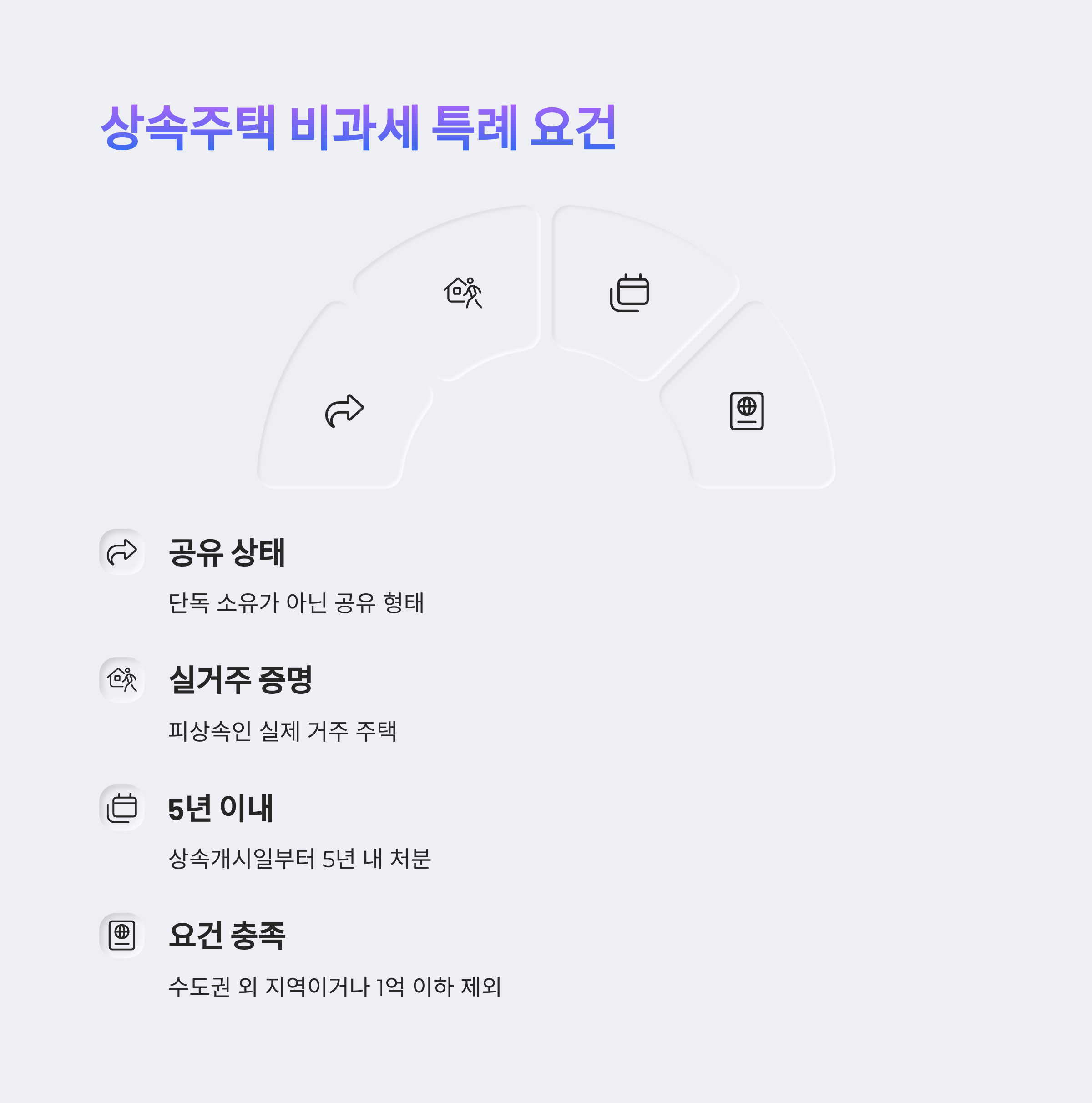 정리하자면, 상속주택은 피상속인이 실제 거주하고 있었고, 자녀들이 공유 지분 형태로 소유하며, 상속 후 5년 이내 처분하면 주택 수에서 제외될 수 있습니다. 또한 상속지분을 한 명에게 집중시키는 방식도 유효하며, 이로 인해 나머지 자녀는 다주택자가 되지 않습니다.