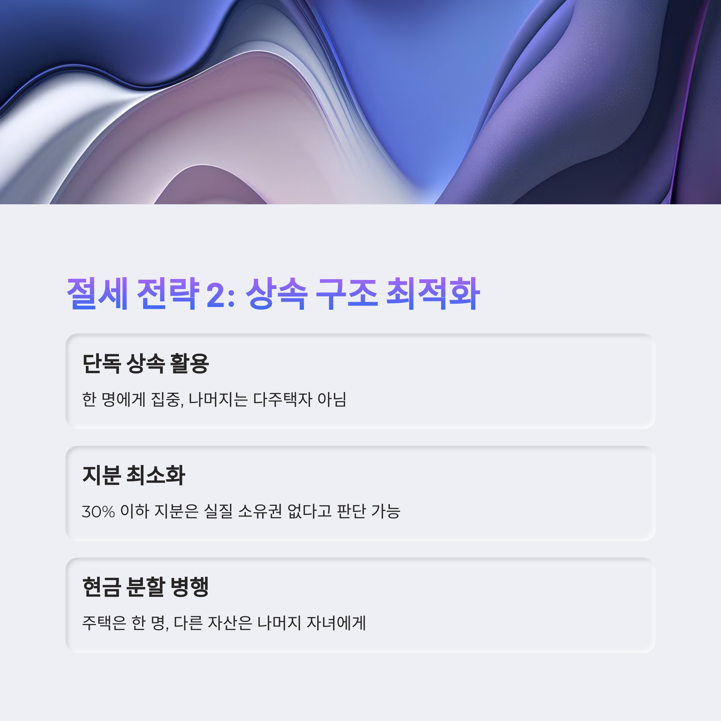 지분이 30% 이하일 경우 실무상 주택 수 산정에서 제외되기도 합니다. 따라서 자녀 중 1인에게만 지분을 몰아주고 나머지는 현금이나 금융자산으로 보상하는 방식이 실무적으로 유리할 수 있습니다.