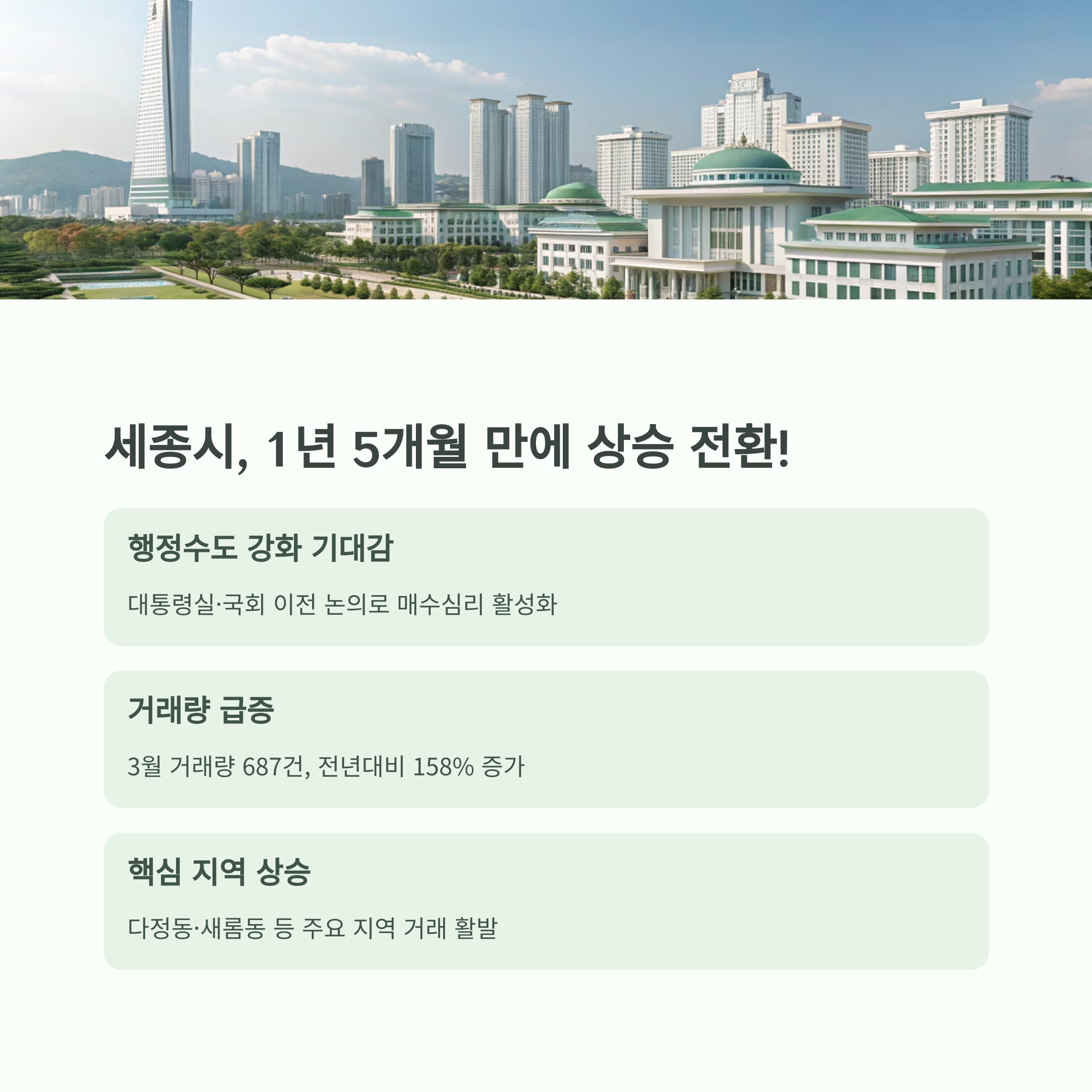 2025년 4월 기준, 세종시의 아파트 매매가격이 1년 반 만에 처음으로 상승세로 전환되었다는 소식이 전해지며 시장의 관심이 집중되고 있습니다. 한국부동산원이 발표한 자료에 따르면, 세종 아파트값은 전주 대비 0.04% 상승하며 그동안의 하락세를 멈추고 새로운 흐름을 보여주고 있습니다. 특히 다정동, 새롬동과 같은 정부청사 인근의 주요 단지를 중심으로 실거래 가격이 점차 회복세를 보이고 있다는 점이 눈길을 끕니다.