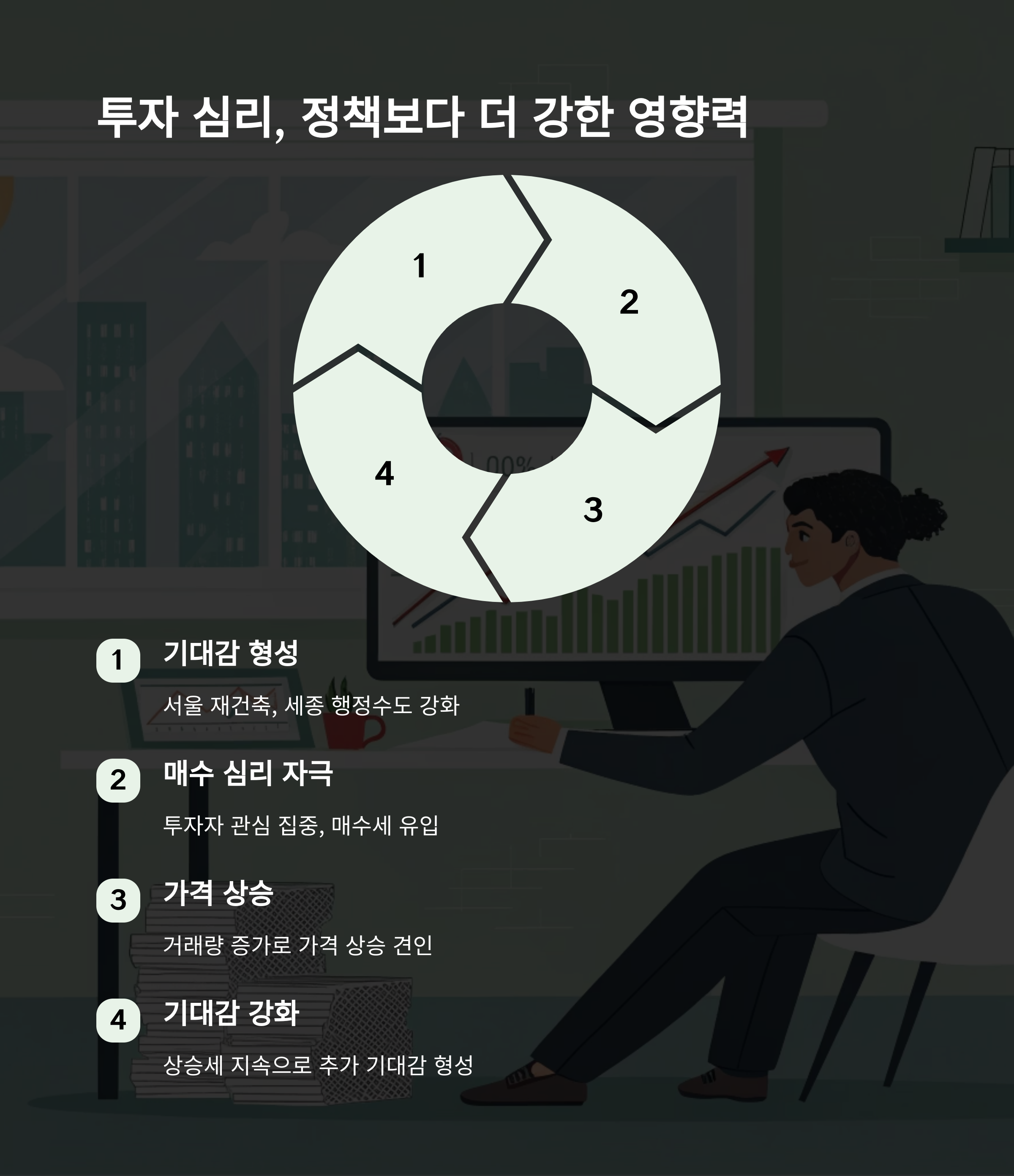 서울과 세종의 동반 반등 흐름에서 정책보다 심리적 요인이 더 큰 역할을 했다는 분석이 다수입니다. 아직 시행되지 않은 정책도 기대감만으로 매수 심리를 유도하며, 특히 온라인 커뮤니티·언론을 통해 확산되는 기대 심리는 거래와 가격에 실질적 영향을 미치고 있습니다.