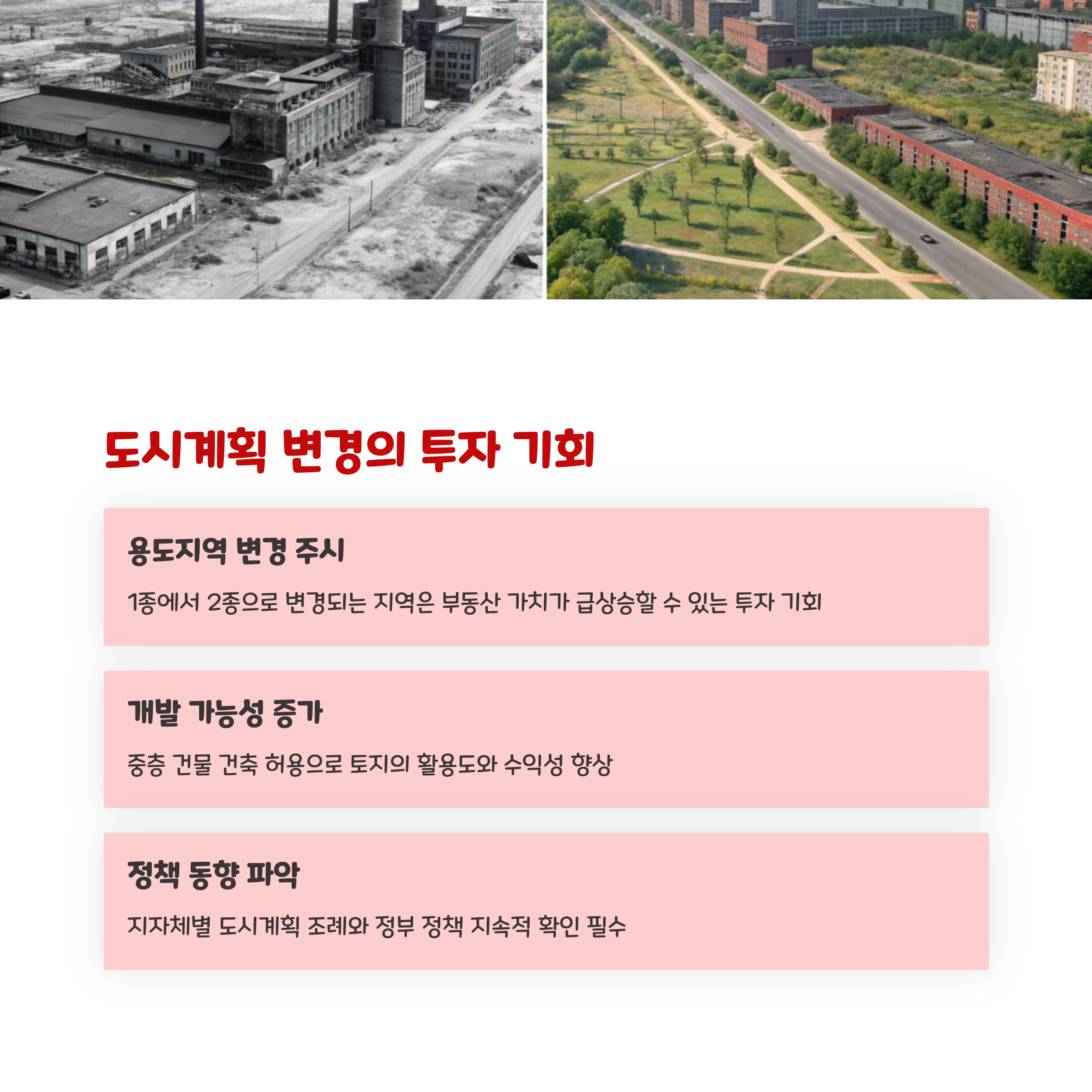 부동산 투자 관점에서 보면, 제2종 일반주거지역은 개발 가능성이 크고 수익성이 높은 반면, 제1종 일반주거지역은 조용한 환경을 원하는 거주자들에게 적합합니다. 정부의 정책 방향에 따라 특정 지역이 1종에서 2종으로 변경될 수도 있으며, 이러한 변화를 미리 파악하면 투자 기회를 잡을 수 있습니다.
