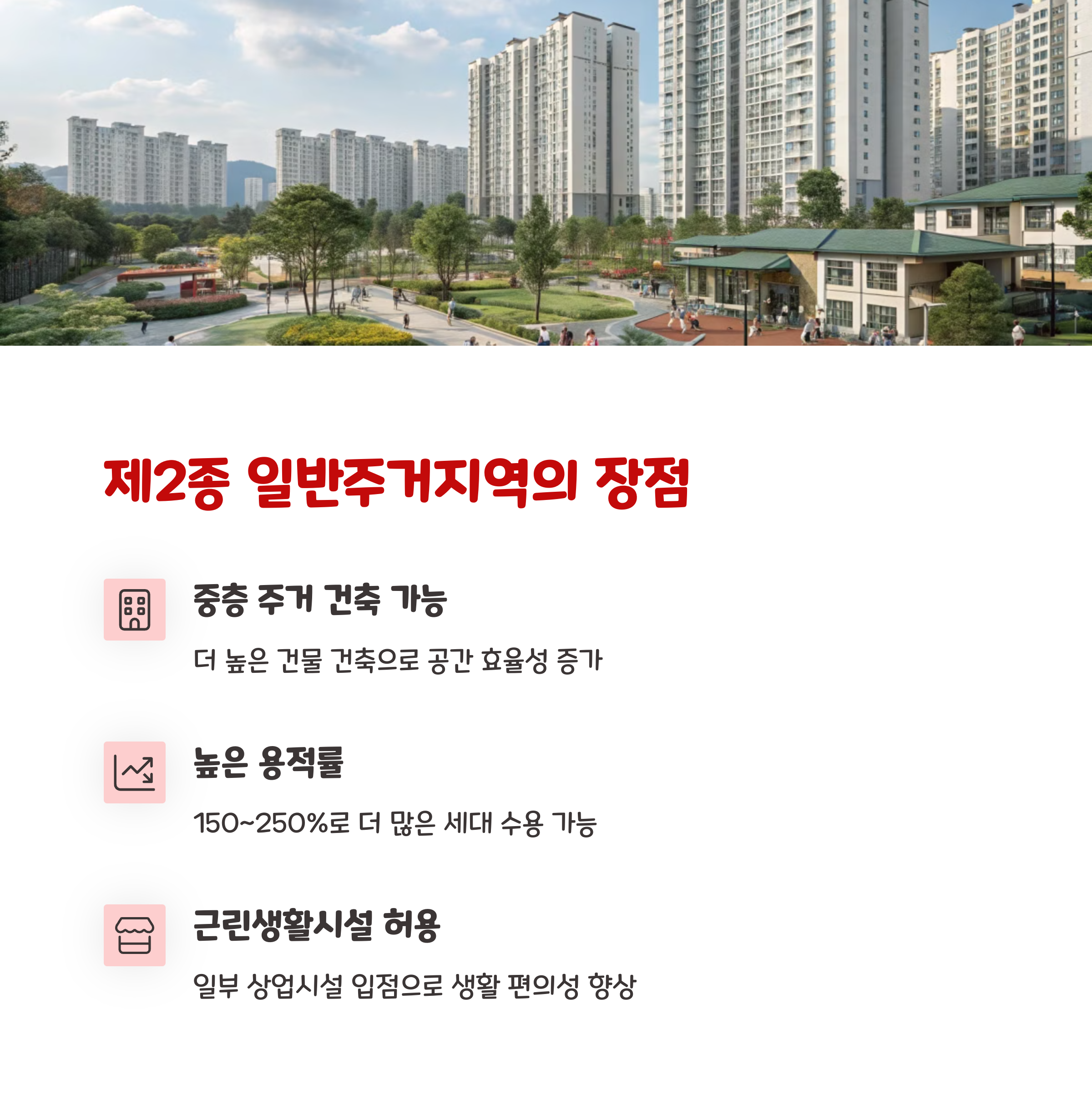 | 제2종 일반주거지역 | 중층 주거지 개발이 가능한 지역으로 제1종보다 용적률이 높음. |