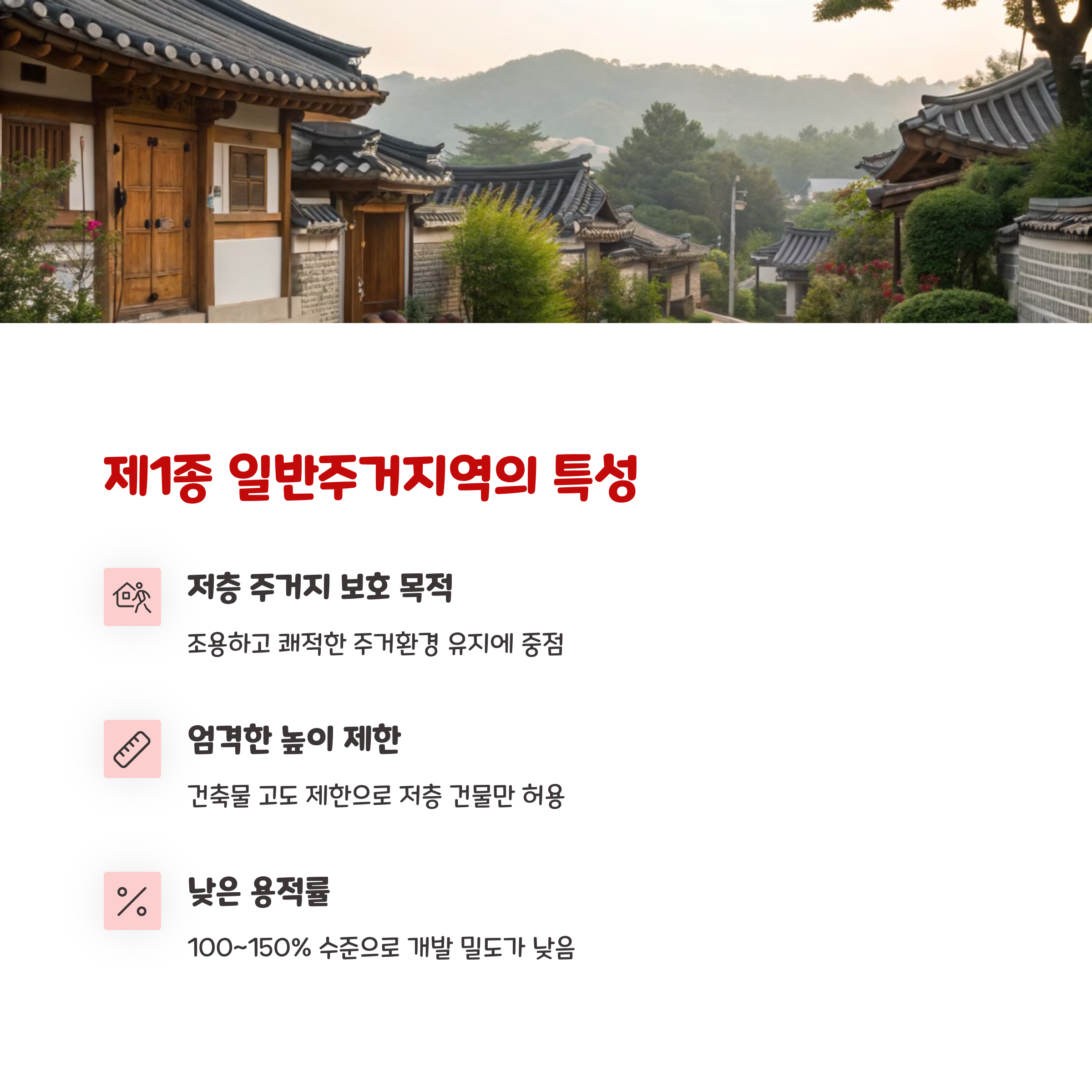 | 제1종 일반주거지역 | 저층 주거지를 보호하는 지역으로 건축물 높이 제한이 엄격함. |