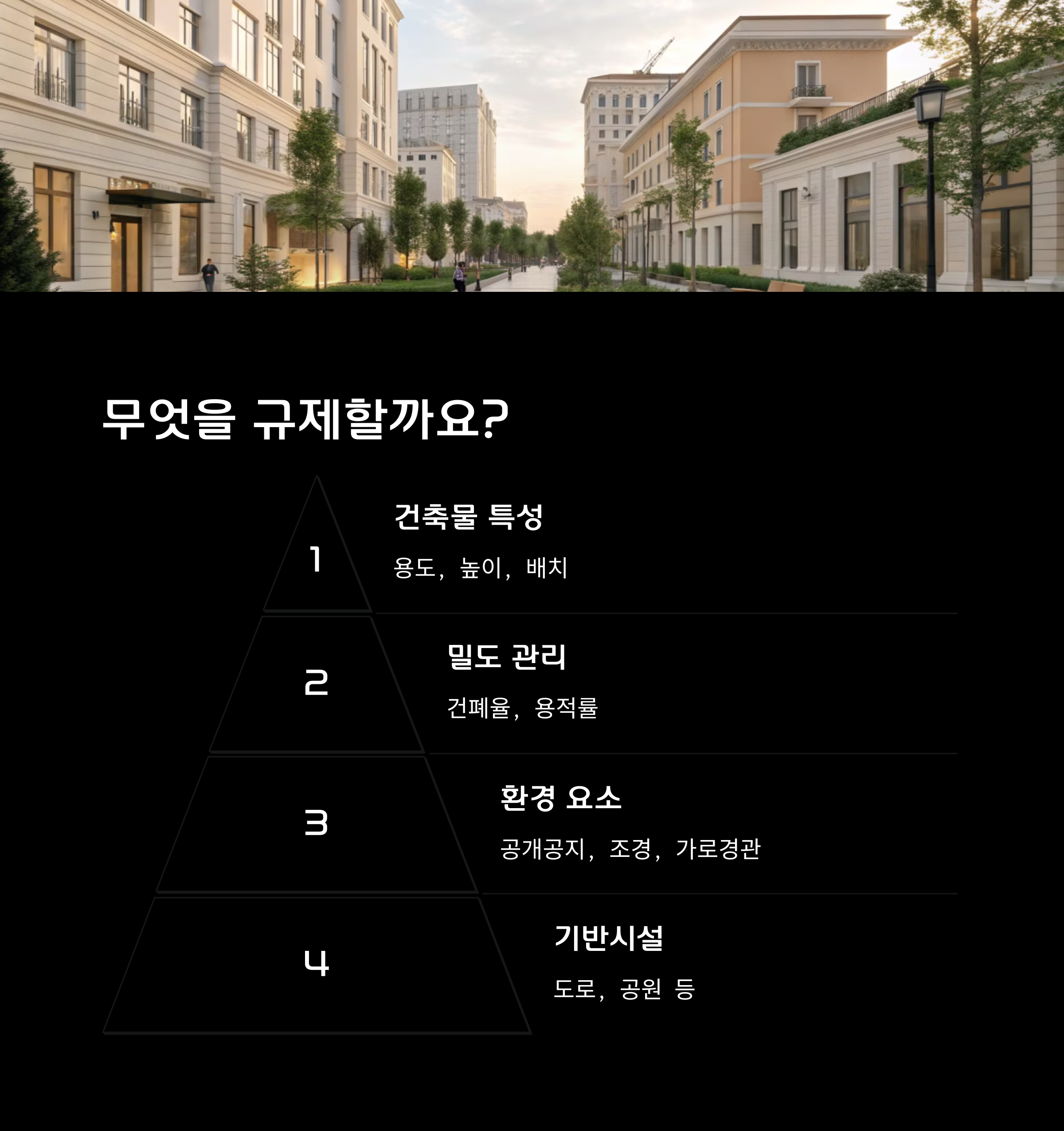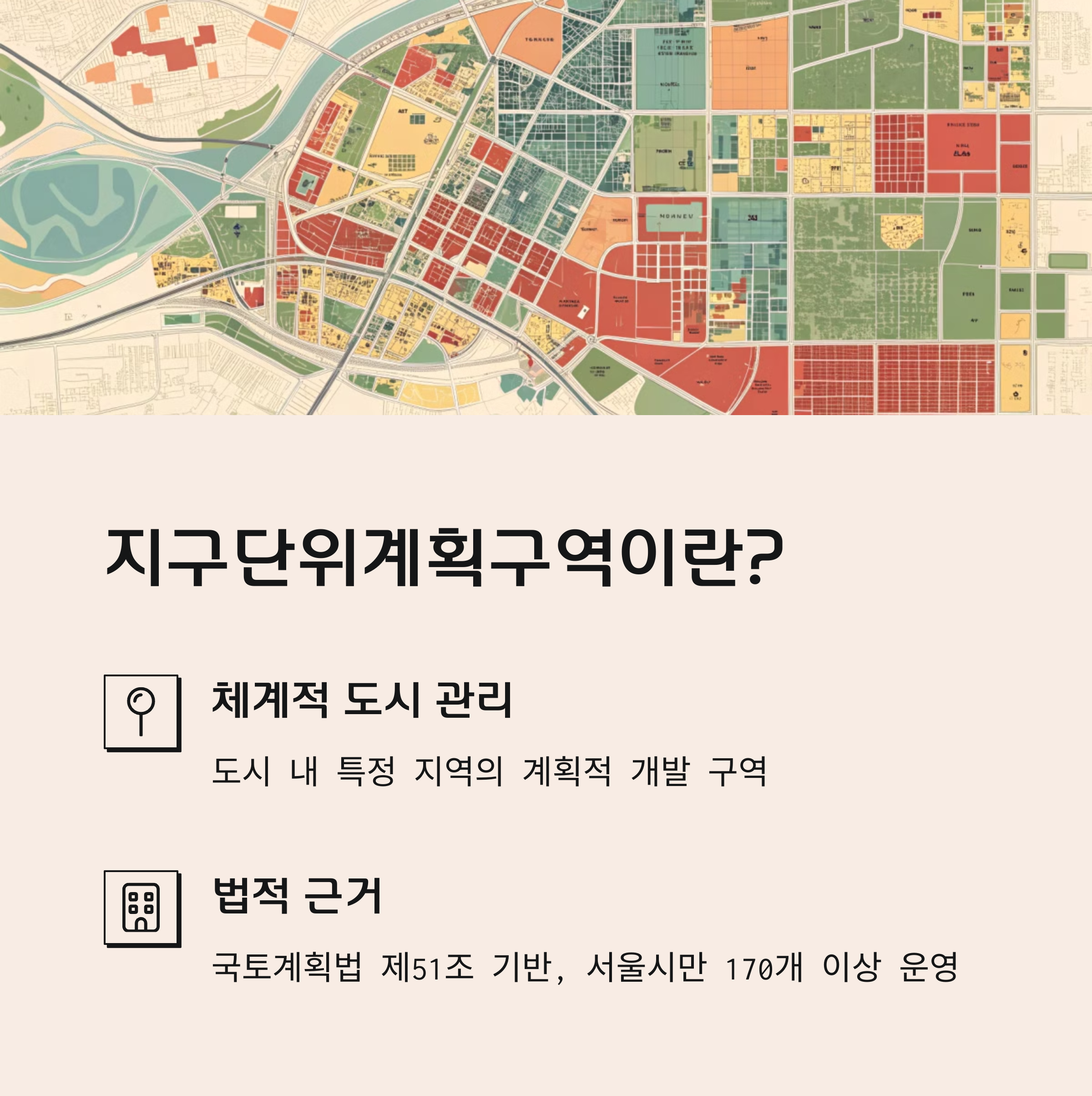 쉽게 말해, 마구잡이로 건물이 들어서는 것을 막고, 도시의 미관과 기능을 체계적으로 설계하는 목적이 있어요.